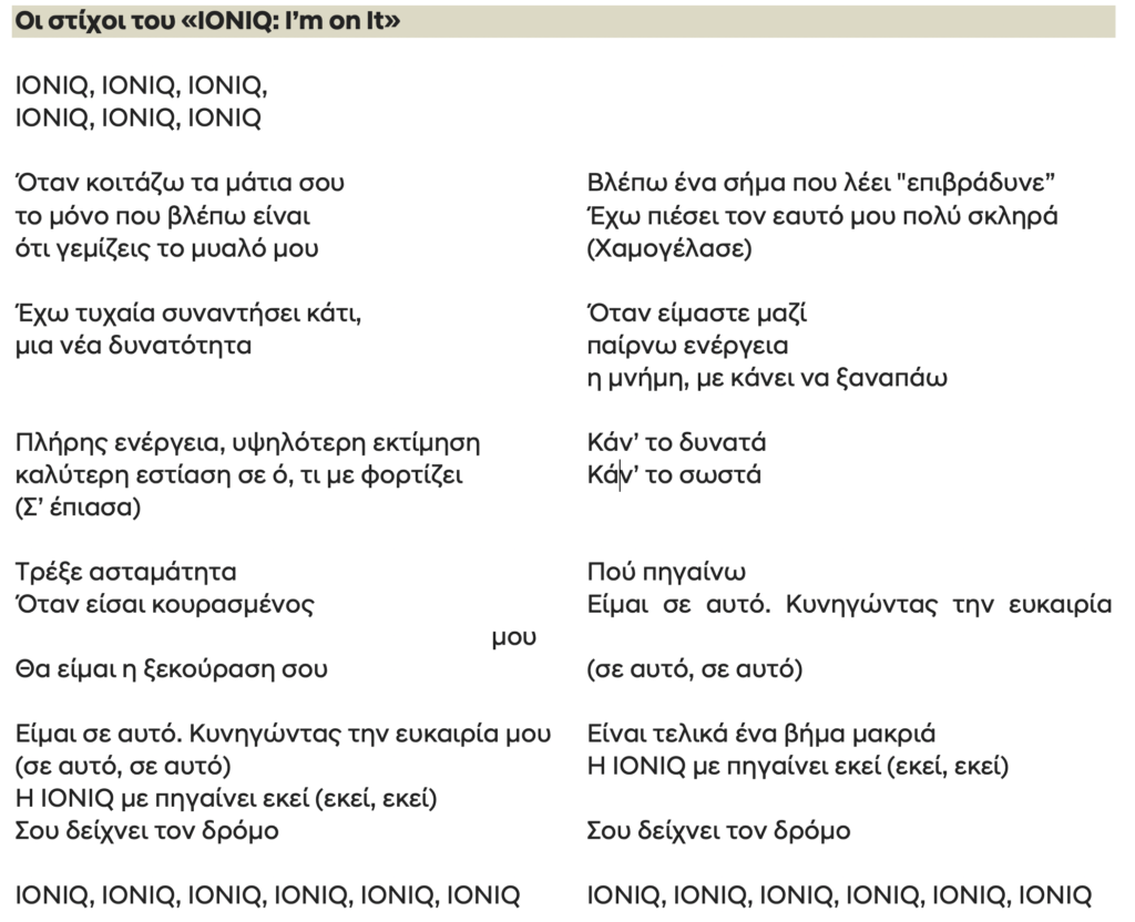 Το τραγούδι της μάρκας «IONIQ: I’m On It» δίνει φωνή στον στόχο της IONIQ να προσφέρει  στους πελάτες EV εμπειρίες με επίκεντρο τις συνδεδεμένες λύσεις του καθημερινού τρόπου ζωής. Οι στίχοι του τραγουδιού, που γράφθηκαν και εκτελέσθηκαν από τους BTS RM, Jin, SUGA, j-hope, Jimin, V και Jung Kook, εκφράζουν συναισθήματα ανακάλυψης, περιέργειας, ελπίδας, δημιουργικότητας και έμπνευσης για το μέλλον και επιβεβαιώνονται από το ρεφρέν “To IONIQ με πηγαίνει εκεί”. Στο videoclip περιλαμβάνεται το τελευταίο concept της Hyundai EV Prophecy που παρουσιάστηκε από την εταιρεία τον Μάρτιο.